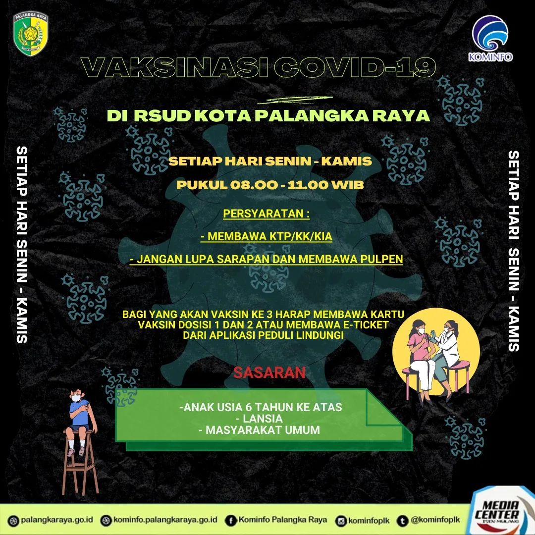 Adapun layanan vaksinasi Covid – 19 yang dilaksanakan oleh RSUD Kota Palangka Raya adalah mulai hari senin hingga kamis mulai pukul 08.00 WIB hingga 11.00 WIB, dengan persyaratan cukup membawa KTP atau KK atau Kia.