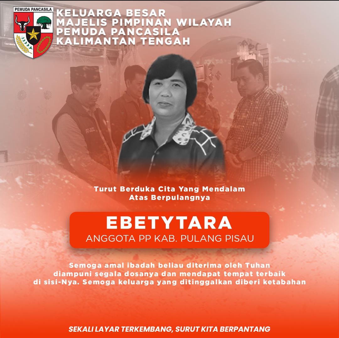 PULANG PISAU, Kalteng co – Kabar duka datang dari Keluarga Besar Pemuda Pancasila Kalimantan Tengah, Ebety Tara anggota PP Kabupaten Pulang Pisau meninggal dunia karena sakit yang dideritanya, Selasa (18/7/2023).