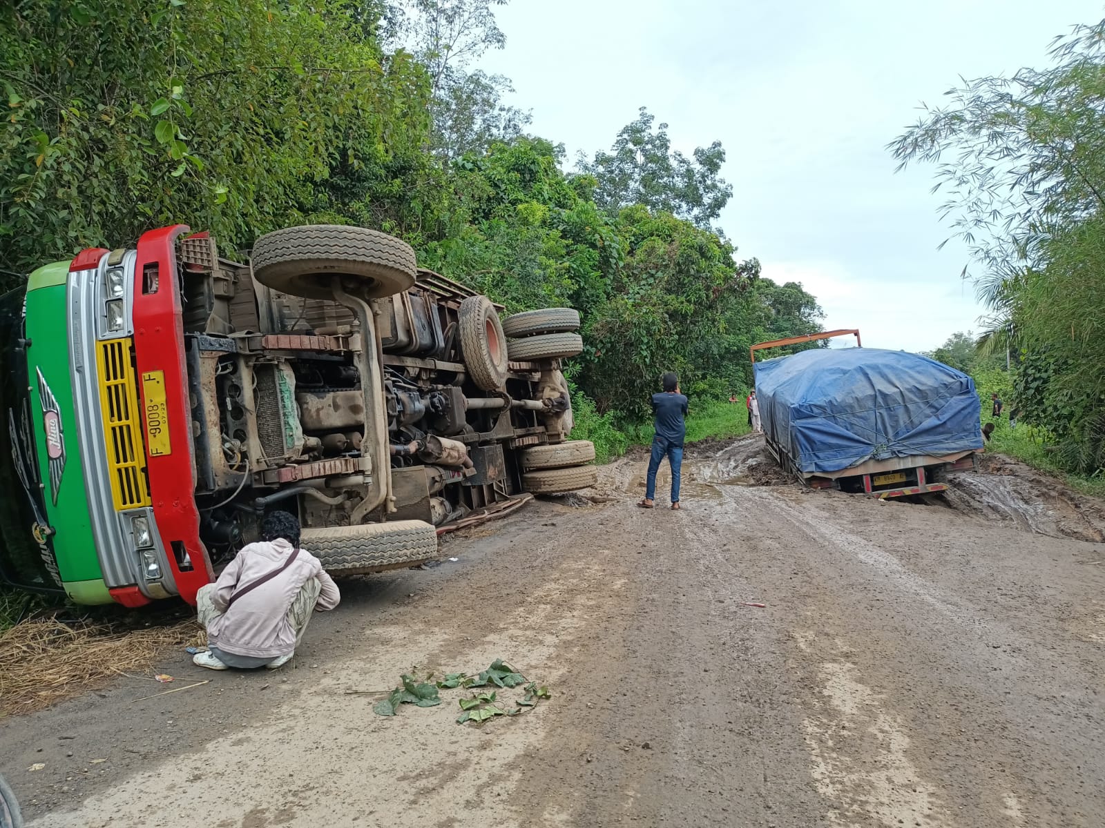 Bahkan di ruas Jalan Buntoi terdapat truk fuso terguling dan satu truk terjebak dalam kubangan. Kondisi ini menyebabkan kendaraan berukurN besar yang hendak menuju Bahaur dan arah sebaliknya menuju Palangka Raya harus mengantre menunggu kendaraan tersebut dievakuasi.