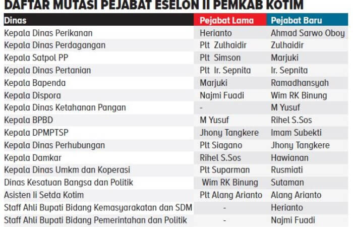 Ia juga menyampaikan, pejabat yang dilantik merupakan pejabat yang telah dinilai dari berbagai aspek dan memiliki kompetensi serta dapat mengemban tugas dan tanggungjawab, dan ada sekitar 316 orang pejabat yang diambil sumpah dan janjinya. Di antaranya, Kepala Dinas Perikanan dari Herianto diganti dengan Ahmad Sarwo Oboy yang sebelumnya menjabat sebagai staf ahli Setda Kotim, Kepala Dinas Perdagangan dijabat oleh Zulhaidir, Kepala Satpol PP sebelumnya dijabat oleh Plt yaitu Simson diganti oleh Marzuki, Kepala Dinas Pertanian dijabat oleh Sepnita, Kepala Bapenda dijabat Ramadhansyah, Kepala Dispora dari Nazmi Fuadi diganti oleh Wim RK Benung, Kepala Dinas Ketahanan Pangan dijabat oleh M. Yusuf yang sebelumnya menjabat sebagai Kepala Pelaksana BPBD dan saat ini diganti oleh Rihel.