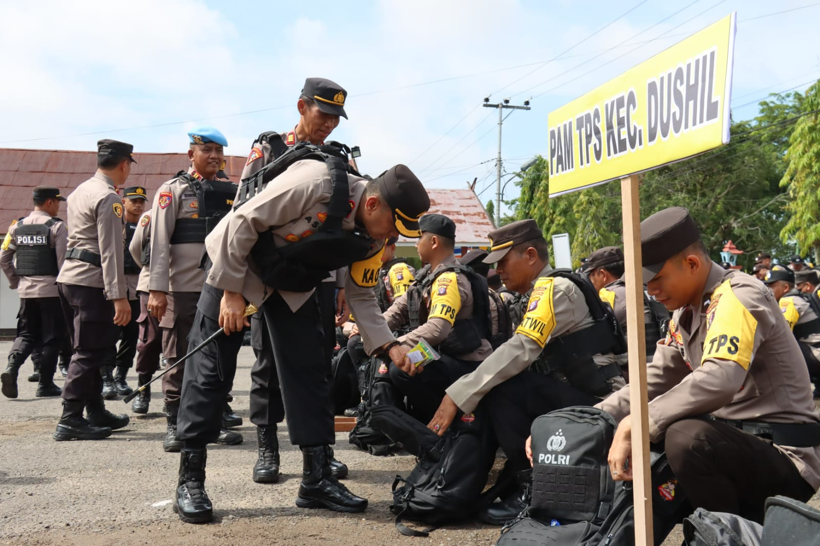 Usai apel, dilanjutkan dengan pengecekan sikap tampang personel, isi perbekalan ransel serta pengecekan senjata api  yang dilarang digunakan saat melaksanakan pengamanan di TPS. (ner)