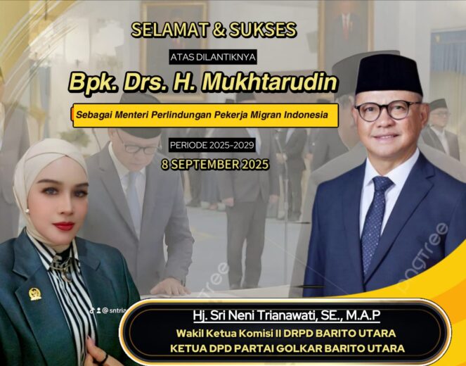 MUARA TEWEH, Kalteng.co – Wakil Ketua Komisi II DPRD Kabupaten Barito Utara sekaligus Ketua DPD Partai Golkar Barito Utara, Hj. Sri Neni Trianawati, SE., M.A.P., memberikan ucapan selamat sekaligus apresiasi atas pelantikan Drs. H. Mukhtarudin sebagai Menteri Perlindungan Pekerja Migran Indonesia (P2MI) oleh Presiden Prabowo Subianto, di Istana Negara, Senin (8/9/2025).