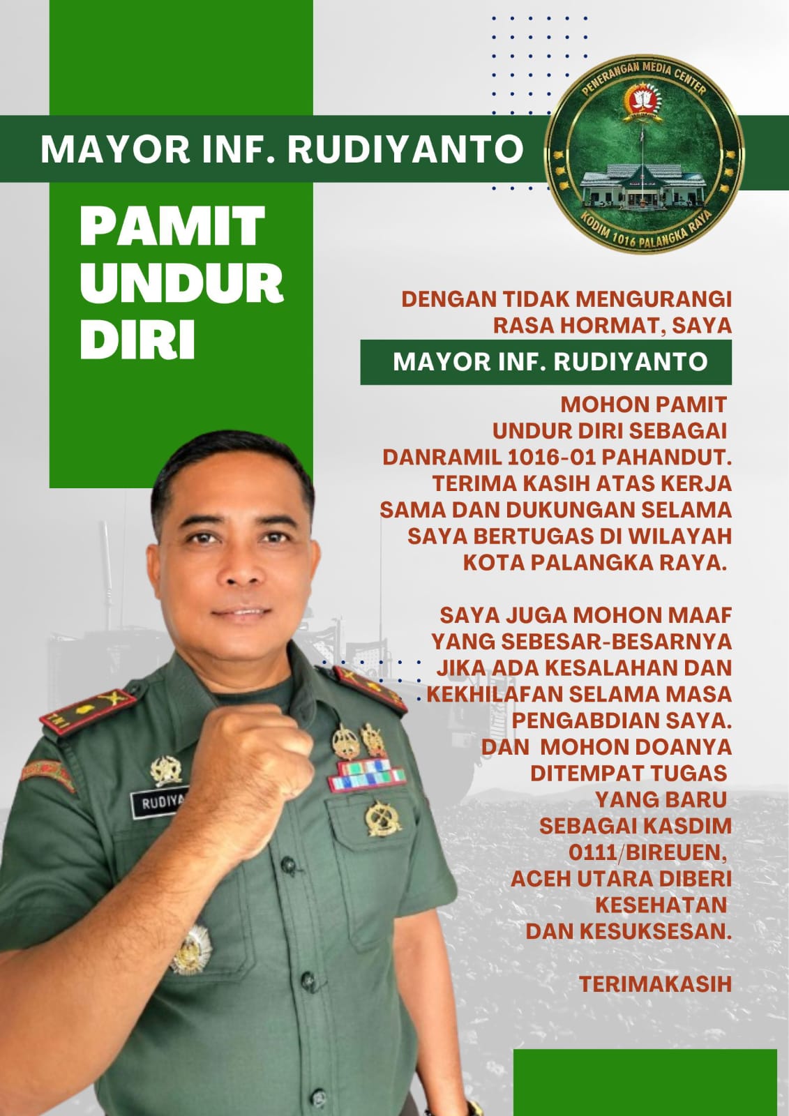 PALANGKA RAYA, Kalteng.co – Setelah lima tahun bertugas di Kalimantan Tengah, Mayor Inf Rudiyanto kini bersiap melanjutkan kariernya sebagai Kasdim 0111/Biruen, Aceh Utara. Pindah tugas dalam karier seorang perwira TNI adalah hal yang biasa, namun apa yang dialami dan dipelajari oleh Mayor Rudiyanto selama bertugas di Palangka Raya meninggalkan kesan mendalam.
