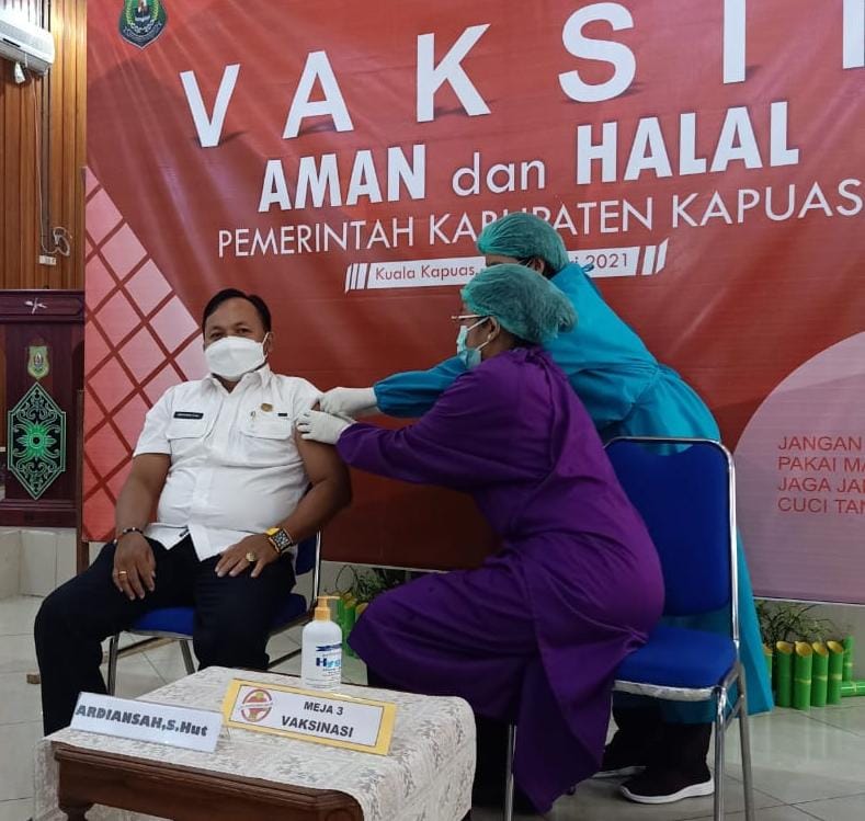 KUALA KAPUAS-KALTENG.CO, Vaksinani Covid-19 kedua bagi para pejabat, tokoh masyarakat, dan tenaga kesehatan (nakes) di Kabupaten Kapuas dilaksanakan,  di Aula Bappeda Kabupaten Kapuas, Rabu (17/2). Salah satunya Ketua DPRD Kabupaten Kapuas, Ardiansah, kembali menjalani vaksin Covid-19 yang kedua.